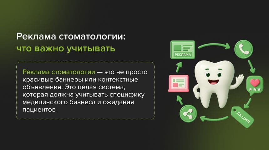 Реклама стоматологии — это не просто красивые баннеры или контекстные объявления. Это целая система, которая должна учитывать специфику медицинского бизнеса и ожидания пациентов. Главная цель маркетинга здесь — показать надежность клиники, высокий уровень врачей и доступность услуг. Если продвижение стоматологической клиники построено грамотно, пациенты будут доверять бренду еще до первого визита.