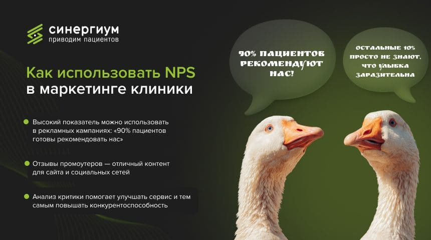 Таким образом, NPS лояльность становится не только внутренним показателем, но и частью стратегии продвижения медицинской организации.